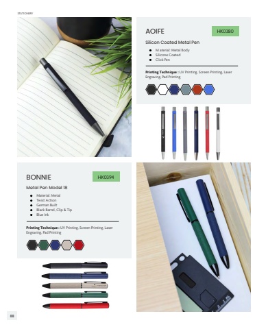 AOIFEBONNIEPrinting Technique : UV Printing, Screen Printing, Laser Engraving, Pad PrintingPrinting Technique : UV Printing, Screen Printing, Laser Engraving, Pad Printing%u2022 M aterial: Metal BodySilicone CoatedClick Pen%u2022 Material: MetalTwist ActionGerman BuiltBlack Barrel, Clip & TipBlue InkSilicon Coated Metal PenMetal Pen Model 18HK0380HK0394STATIONERY88