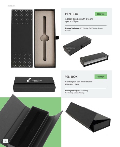 PEN BOXPEN BOXPrinting Technique : UV Printing, Pad Printing, Screen PrintingPrinting Technique : UV Printing, Pad Printing, Screen PrintingA black pen box with a foam space of 1 pen.A black pen box with a foam space of 1 pen.HK0463HK0464STATIONERY98