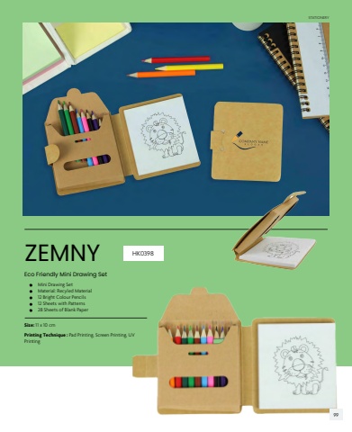 ZEMNYSize: 11 x 10 cm%u2022 Mini Drawing SetMaterial: Recyled Material12 Bright Colour Pencils12 Sheets with Patterns%u2022 28 Sheets of Blank PaperEco Friendly Mini Drawing SetHK0398Printing Technique : Pad Printing, Screen Printing, UV PrintingSTATIONERY99