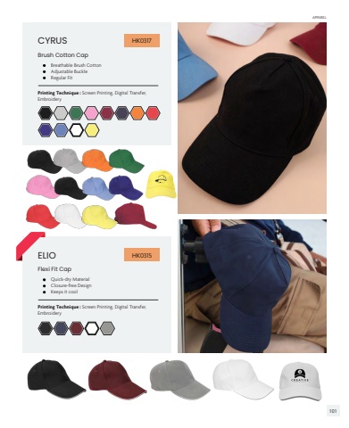 CYRUSELIO Printing Technique : Screen Printing, Digital Transfer, EmbroideryPrinting Technique : Screen Printing, Digital Transfer, Embroidery%u2022 Breathable Brush CottonAdjustable BuckleRegular Fit%u2022 Quick-dry MaterialClosure-free DesignKeeps it coolBrush Cotton CapFlexi Fit CapHK0317 HK0315APPAREL101