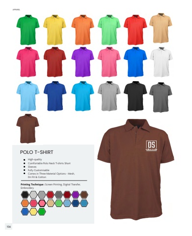 POLO T-SHIRTPrinting Technique : Screen Printing, Digital Transfer, Embroidery%u2022 High-quality Comfortable Polo Neck T-shirts Short SleevesFully Customisable Comes in Three Material Options - Mesh, Dri Fit & CottonAPPAREL106