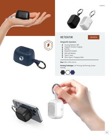 RETENTIRSize: 6.39 x 4.78 x 3.6 cm%u2022 Housing Material: ABS%u2022 Magsafe Wireless Charging%u2022 Keyring%u2022 Bluetooth Enabled%u2022 400 mAh Battery%u2022 Type-C Input%u2022 30cm Type-C Charging CableMagsafe SpeakerHK0506Printing Technique : UV Printing, Pad Printing, Screen PrintingGADGETS GADGETS8 9