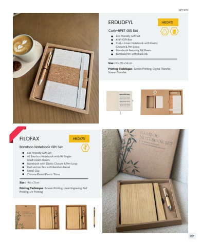 ERDUDFYLFILOFAXSize : 31 x 39 x 14 cmSize : 14.6 x 21cm%u2022 Eco-friendly Gift Set %u2022 Kraft Gift Box %u2022 Cork + Linen Notebook with Elastic Closure & Pen Loop %u2022 Notebook featuring 96 Sheets%u2022 Bamboo Pen with Black Ink%u2022 Eco-friendly Gift Set%u2022 A5 Bamboo Notebook with 96 Singlelined Cream Sheets%u2022 Notebook with Elastic Closure & Pen Loop%u2022 Push Action Pen with Bamboo Barrel%u2022 Metal Clip %u2022 Chrome Plated Plastic TrimsCork+RPET Gift SetBamboo Notebook Gift SetHK0411HK0475 Printing Technique : Screen Printing, Digital Transfer, Screen TransferPrinting Technique : Screen Printing, Laser Engraving, Pad Printing, UV PrintingGIFT SETS107