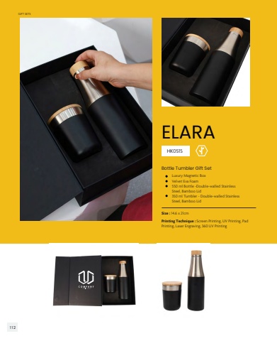 ELARAHK0515Size : 14.6 x 21cm%u2022 Luxury Magnetic BoxVelvet Eva Foam550 ml Bottle -Double-walled Stainless Steel, Bamboo Lid350 ml Tumbler - Double-walled Stainless Steel, Bamboo LidBottle Tumbler Gift SetPrinting Technique : Screen Printing, UV Printing, Pad Printing, Laser Engraving, 360 UV PrintingGIFT SETS112GIFT SETS