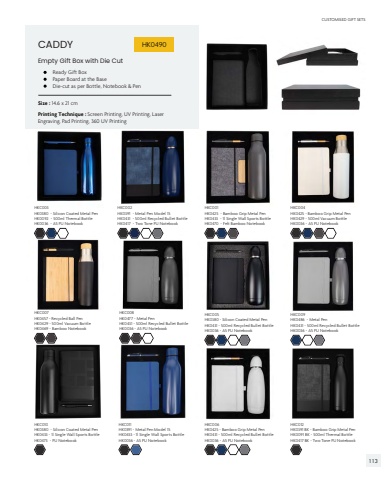CADDYSize : 14.6 x 21 cm%u2022 Ready Gift BoxPaper Board at the BaseDie-cut as per Bottle, Notebook & PenEmpty Gift Box with Die CutHK0490Printing Technique : Screen Printing, UV Printing, Laser Engraving, Pad Printing, 360 UV PrintingHKC003 HK0380 - Silicon Coated Metal PenHK0092 - 500ml Thermal BottleHK0036 - A5 PU NotebookHKC007HK0457 - Recycled Ball Pen HK0429 - 500ml Vacuum BottleHK0469 - Bamboo NotebookHKC010HK0380 - Silicon Coated Metal PenHK0433 - 1l Single Wall Sports BottleHK0473 - PU NotebookHKC011HK0391 - Metal Pen Model 15HK0433 - 1l Single Wall Sports BottleHK0036 - A5 PU NotebookHKC008HK0477 - Metal Pen HK0431 - 500ml Recycled Bullet BottleHK0036 - A5 PU NotebookHKC005HK0380 - Silicon Coated Metal PenHK0431 - 500ml Recycled Bullet BottleHK0036 - A5 PU NotebookHKC009HK0486 - Metal Pen HK0431 - 500ml Recycled Bullet BottleHK0036 - A5 PU NotebookHKC006HK0425 - Bamboo Grip Metal PenHK0431 - 500ml Recycled Bullet BottleHK0036 - A5 PU NotebookHKC012HK0391 BK - Bamboo Grip Metal Pen HK0091 BK - 500ml Thermal BottleHK0417 BK - Two Tone PU NotebookHKC001HK0425 - Bamboo Grip Metal PenHK0433 - 1l Single Wall Sports BottleHK0470 - Felt Bamboo NotebookHKC004HK0425 - Bamboo Grip Metal PenHK0429 - 500ml Vacuum BottleHK0036 - A5 PU NotebookHKC002 HK0391 - Metal Pen Model 15HK0431 - 500ml Recycled Bullet BottleHK0417 - Two Tone PU NotebookCUSTOMISED GIFT SETS113