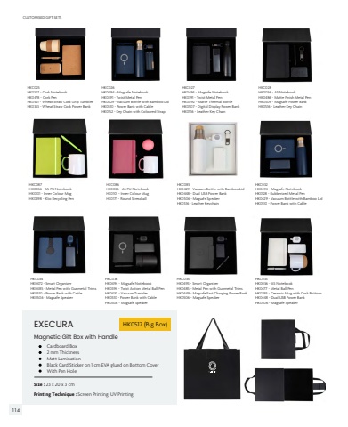 EXECURASize : 23 x 20 x 3 cm%u2022 Cardboard Box2 mm ThicknessMatt LaminationBlack Card Sticker on 1 cm EVA glued on Bottom CoverWith Pen HoleMagnetic Gift Box with HandleHK0517 (Big Box)Printing Technique : Screen Printing, UV PrintingHKC025HK0107 - Cork NotebookHK0478 - Cork PenHK0421 - Wheat Straw Cork Grip TumblerHK0333 - Wheat Straw Cork Power BankHKC087 HK0036 - A5 PU NotebookHK0101 - Inner Colour MugHK0498 - Klio Recycling PenHKC034HK0472 - Smart OrganizerHK0485 - Metal Pen with Gunmetal TrimsHK0510 - Power Bank with CableHK0506 - Magsafe SpeakerHKC036HK0494 - Magsafe NotebookHK0394 - Twist Action Metal Ball PenHK0430 - Vacuum TumblerHK0510 - Power Bank with CableHK0506 - Magsafe SpeakerHKC086 HK0036 - A5 PU NotebookHK0101 - Inner Colour MugHK0171 - Round StressballHKC085 HK0429 - Vacuum Bottle with Bamboo LidHK0448 - Dual USB Power BankHK0506 - Magsafe SpeakerHK0516 - Leather KeychainHKC032HK0494 - Magsafe NotebookHK0128 - Rubberized Metal PenHK0429 - Vacuum Bottle with Bamboo LidHK0510 - Power Bank with CableHKC034HK0493 - Smart OrganizerHK0485 - Metal Pen with Gunmetal TrimsHK0449 - Magsafe Fast Charging Power BankHK0506 - Magsafe SpeakerHKC035HK0036 - A5 NotebookHK0477 - Metal Ball PenHK0295 - Ceramic Mug with Cork BottomHK0448 - Dual USB Power BankHK0506 - Magsafe SpeakerHKC027HK0494 - Magsafe NotebookHK0391 - Twist Metal PenHK0092 - Matte Thermal BottleHK0507 - Digital Display Power Bank HK0516 - Leather Key Chain HKC028HK0036 - A5 NotebookHK0486 - Matte Finish Metal PenHK0509 - Magsafe Power Bank HK0516 - Leather Key Chain HKC026HK0494 - Magsafe NotebookHK0391 - Twist Metal PenHK0429 - Vacuum Bottle with Bamboo LidHK0510 - Power Bank with CableHK0152 - Key Chain with Coloured StrapCUSTOMISED GIFT SETS114