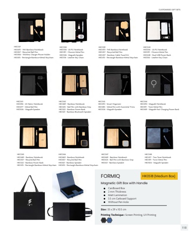 FORMIQSize : 33 x 29 x 10.5 cm%u2022 Cardboard Box2 mm ThicknessMatt Lamination3.5 cm Carboard SupportWithout Pen HoleMagnetic Gift Box with HandleHK0518 (Medium Box)Printing Technique : Screen Printing, UV PrintingHKC037HK0470 - Felt Bamboo NotebookHK0457 - Recycled Ball PenHK0456 - Wireless Charger Phone HolderHK0415 - Rectangle Bamboo+Metal KeychainHKC041HK0396 - A5 Fabric NotebookHK0477 - Metal Ball PenHK0506 - Magsafe SpeakerHKC045HK0469 - Bamboo NotebookHK0457 - Recyled Ball PenHK0322 - Bamboo Power BankHK0415 - Rectangle Bamboo+Metal KeychainHKC046HK0469 - Bamboo NotebookHK0457 - Recyled Ball PenHK0321 - Bamboo SpeakerHK0415 - Rectangle Bamboo+Metal KeychainHKC042HK0469 - Bamboo NotebookHK0425 - Ball Pen with Bamboo GripHK0322 - Bamboo Power BankHK0321 - Bamboo Bluetooth SpeakerHKC043HK0493 - Smart OrganizerHK0485 - Metal Pen with Gunmetal TrimsHK0506 - Magsafe SpeakerHKC044HK0494 - Magsafe NotebookHK0391 - Twist Metal PenHK0449 - Magsafe Fast Charging Power BankHKC047HK0469 - Bamboo NotebookHK0425 - Ball Pen with Bamboo GripHK0321 - Bamboo SpeakerHKC048HK0417 - Two Tone NotebookHK0391 - Twist Metal PenHK0506 - Magsafe SpeakerHKC039HK0470 - Felt Bamboo NotebookHK0457 - Recycled Ball PenHK0407 - Bamboo Cable Travel KitHK0415 - Rectangle Bamboo+Metal KeychainHKC040HK0036 - A5 PU NotebookHK0391 - Chrome Metal PenHK0448 - Dual USB Power BankHK0516 - Leather Key ChainHKC038HK0036 - A5 PU NotebookHK0391 - Chrome Metal PenHK0506 - Magsafe SpeakerHK0516 - Leather Key ChainCUSTOMISED GIFT SETS115