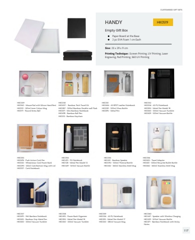 HANDYSize : 33 x 29 x 9 cm%u2022 Paper Board at the Base%u2022 2 pc EVA Foam 1 cm EachEmpty Gift BoxHK0519Printing Technique : Screen Printing, UV Printing, Laser Engraving, Pad Printing, 360 UV PrintingHKC049 HK0160 - Mouse Pad with Silicon Hand RestHK0101 - 320ml Inner Colour MugHK0171 - Round Stress BallHKC053 HK0476 - Push Action Cork PenHK0333 - Wheatstraw Cork Power BankHK0295 - 325ml Cork Bottom Mug with LidHK0107 - Cork NotebookHKC057HK0470 - Felt Bamboo NotebookHK0425 - Bamboo Grip Metal PenHK0430 - 300ml Vacuum TumblerHKC058HK0493 - Power Bank OrganizerHK0394 - Metal Pen Model 18HK0430 - 300ml Vacuum TumblerHKC054 HK0473 - PU NotebookHK0128 - Metal Pen Model 12HK0429 - 500ml Vacuum BottleHKC055 HK0451 - Bamboo SpeakerHK0092 - 500ml Thermal BottleHK0442 - 360ml Stainless Steel MugHKC056 HK0423 - Travel AdapterHK0431 - 500ml Recycled Bullet BottleHK0442 - 360ml Stainless Steel MugHKC059HK0036 - A5 PU NotebookHK0393 - Metal Pen Model 17HK0434 - 380ml Vacuum MugHKC060 HK0447 - Speaker with Wireless ChargingHK0429 - 500ml Vacuum BottleHK0471 - Bamboo Notebook with Sticky NotesHKC051 HK0446 - A5 RPET Leather NotebookHK0239 - 500ml Glass BottleHK0395 - Metal PenHKC052HK0036 - A5 PU NotebookHK0394 - Metal Pen Model 18HK0430 - 300ml Vacuum TumblerHK0429 - 500ml Vacuum BottleHKC050 HK0407 - Bamboo Tech Travel KitHK0287 - 500ml Bamboo Double-wall FlaskHK0471 - Mini Bamboo NotebookHK0478 - Bamboo Ball PenHK0313 - Bamboo KeychainCUSTOMISED GIFT SETS117