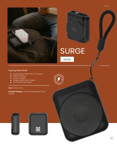 SURGESize: 10 x 6.6 x 9.4 cm%u2022 Housing Material: ABS without Oil Coating%u2022 10000 mAh Battery%u2022 Wireless Charging%u2022 Charges Mobile, Iwatch, Airpods%u2022 5W, 7.5W, 10W, 15W OutputKeyring Power BankHK0508Printing Technique : UV Printing, Pad Printing, Screen PrintingGADGETS GADGETS10 11