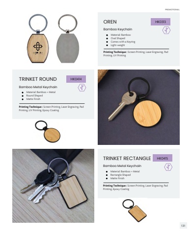 ORENTRINKET ROUNDTRINKET RECTANGLE%u2022 Material: BambooOval ShapedComes with a KeyringLight-weight %u2022 Material: Bamboo + MetalRound ShapedMatte Finish%u2022 Material: Bamboo + MetalRectangle ShapedMatte FinishBamboo KeychainBamboo Metal KeychainBamboo Metal KeychainHK0313HK0414HK0415Printing Technique : Screen Printing, Laser Engraving, Pad Printing, UV PrintingPrinting Technique : Screen Printing, Laser Engraving, Pad Printing, UV Printing, Epoxy CoatingPrinting Technique : Screen Printing, Laser Engraving, Pad Printing, Epoxy CoatingPROMOTIONAL131