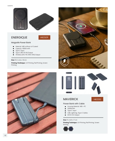 MAVERICKSize: 15 x 6.8 x 1.7 cm%u2022 Housing Material: ABS + PC%u2022 10000mAh%u2022 Type-C Input%u2022 USB, Lightning, Type-C Cables%u2022 DC5V/2A OutputPower Bank with CableHK0510ENERGIQUESize: 10.2 x 6.6 x 1.8 cm%u2022 Material: ABS without oil Coated%u2022 Capacity: 10000 mAh%u2022 Type C Input%u2022 Type C (PD 20 W) Output%u2022 Wireless (5W, 7W, 10W, 15W) OutputMagsafe Power BankHK0509Printing Technique : UV Printing, Pad Printing, Screen PrintingPrinting Technique : UV Printing, Pad Printing, Screen PrintingGADGETS GADGETS12 13