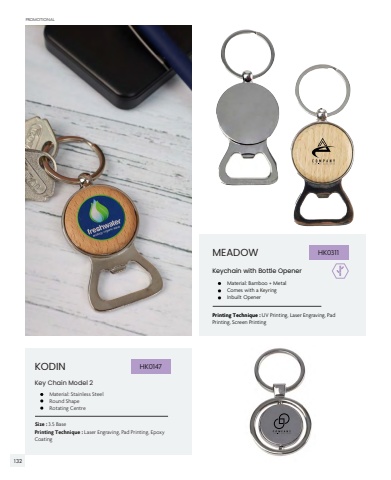 MEADOWKODIN%u2022 Material: Stainless Steel Round Shape Rotating CentreKey Chain Model 2HK0311HK0147Printing Technique : Laser Engraving, Pad Printing, Epoxy CoatingSize : 3.5 Base%u2022 Material: Bamboo + MetalComes with a KeyringInbuilt OpenerKeychain with Bottle Opener Printing Technique : UV Printing, Laser Engraving, Pad Printing, Screen PrintingPROMOTIONAL132
