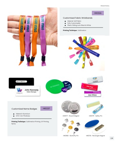 %u2022 Material: Aluminium0.75-1 mm Thickness HK0177 - Round MagnetHK0180 - Butterfly PinHK0179 - Safety PinHK0176 - Rectangle MagnetCustomized Name Badges HK0237Printing Technique : Sublimation Printing, UV Printing, Epoxy%u2022 Material: Soft FabricFully Customisable Plastic Sliding Lock: Black & WhiteCustomised Fabric WristbandsHK0326 Printing Technique : SublimationPROMOTIONAL139