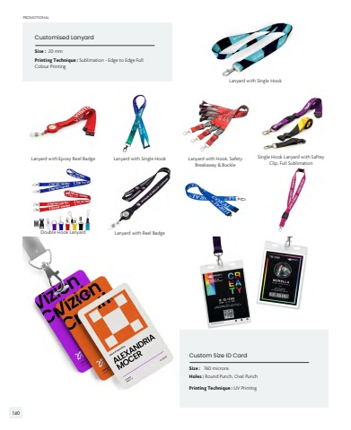 Customised LanyardCustom Size ID CardPrinting Technique : Sublimation - Edge to Edge Full Colour PrintingHoles : Round Punch, Oval PunchPrinting Technique : UV PrintingSize : 20 mmSize : 760 micronsLanyard with Single HookLanyard with Epoxy Reel BadgeDouble Hook Lanyard Lanyard with Reel BadgeLanyard with Single Hook Single Hook Lanyard with Saftey Clip, Full Sublimation Lanyard with Hook, Safety Breakaway & BucklePROMOTIONAL140