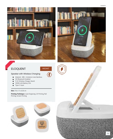 ELOQUENTSize : 11.6 x 11 x 6.26 cmPrinting Technique : Laser Engraving, UV Printing, Pad Printing, Screen Printing%u2022 Material : ABS + Imitation Linen Bamboo%u2022 5W Bluetooth Enabled%u2022 15 W Wireless Charger Inbuilt12000 mAh Battery LifeType-C InputSpeaker with Wireless ChargingHK0447GADGETS GADGETS12 13
