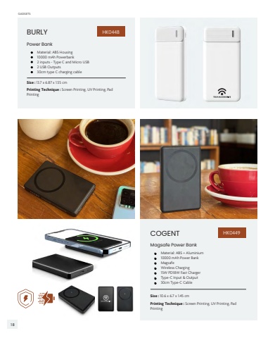 COGENTSize : 10.6 x 6.7 x 1.45 cmPrinting Technique : Screen Printing, UV Printing, Pad Printing %u2022 Material: ABS + Aluminium%u2022 10000 mAh Power Bank%u2022 Magsafe %u2022 Wireless Charging%u2022 15W PD18W Fast Charger%u2022 Type-C Input & Output%u2022 30cm Type-C CableMagsafe Power BankHK0449BURLYSize : 13.7 x 6.87 x 1.55 cmPrinting Technique : Screen Printing, UV Printing, Pad Printing%u2022 Material: ABS Housing%u2022 10000 mAh Powerbank %u2022 2 inputs - Type C and Micro USB %u2022 2 USB Outputs%u2022 30cm type C charging cablePower BankHK0448GADGETS GADGETS18 19