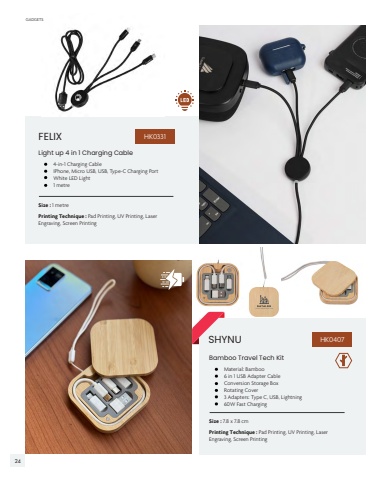FELIXSize : 1 metrePrinting Technique : Pad Printing, UV Printing, Laser Engraving, Screen Printing%u2022 4-in-1 Charging Cable %u2022 IPhone, Micro USB, USB, Type-C Charging Port %u2022 White LED Light%u2022 1 metreLight up 4 in 1 Charging Cable HK0331SHYNUSize : 7.8 x 7.8 cmPrinting Technique : Pad Printing, UV Printing, Laser Engraving, Screen Printing%u2022 Material: Bamboo%u2022 6 in 1 USB Adapter Cable %u2022 Conversion Storage Box %u2022 Rotating Cover %u2022 3 Adapters: Type C, USB, Lightning %u2022 60W Fast Charging Bamboo Travel Tech KitHK0407GADGETS GADGETS24 25