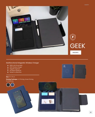 GEEKSize: 27 x 19 cm%u2022 8000 mAh Power Bank10W Wireless ChargerMagsafe Organiser64 Sheets NotebookPacked in a Black BoxMultifunctional Magnetic Wireless ChargerHK0493Printing Technique : UV Printing, Screen Printing, D-embossingGADGETS GADGETS24 25