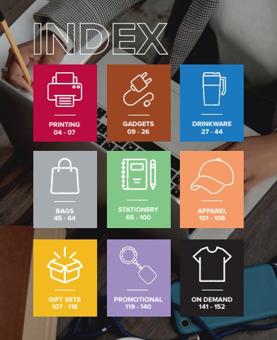 INDEXGADGETS09 - 26DRINKWARE27 - 44STATIONERY65 - 100APPAREL101 - 106BAGS45 - 64PROMOTIONAL119 - 140ON DEMAND141 - 152GIFT SETS107 - 118PRINTING04 - 07