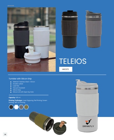 TELEIOS Capacity: 500 ml%u2022 Material: Stainless Steel + Silicon%u2022 Double-walled%u2022 Leak-free%u2022 Vacuum Insulated%u2022 Silicon Grip%u2022 Silicon Lid with Open Sip HoleTumbler with Silicon GripHK0372Printing Technique : Laser Engraving, Pad Printing, Screen Printing, 360%u00b0 UV PrintingDRINKWARE28DRINKWARE