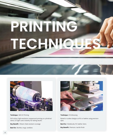 Technique : 360 UV Printing Technique : D-EmbossingBest For : Bottles, mugs, tumblersKey Benefit : Vibrant, fade-resistant coverage Best For : Notebooks, PU leather itemsKey Benefit : Premium, tactile finishFull-colour, high-resolution wraparound printing on cylindrical items; UV light cures instantly for lasting results.Raised or sunken designs on PU or leather using precision dyes.PRINTING TECHNIQUESPRINTING TECHNIQUE PRINTING TECHNIQUE4 5
