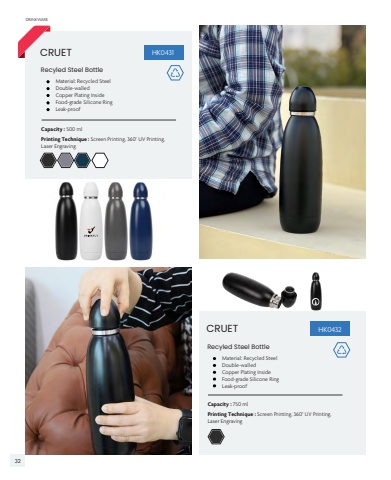 CRUET %u2022 Material: Recycled Steel%u2022 Double-walled%u2022 Copper Plating Inside%u2022 Food-grade Silicone Ring %u2022 Leak-proofRecyled Steel BottleHK0431 Capacity : 500 mlPrinting Technique : Screen Printing, 360%u00b0 UV Printing, Laser Engraving%u2022 Material: Recycled Steel%u2022 Double-walled%u2022 Copper Plating Inside%u2022 Food-grade Silicone Ring %u2022 Leak-proofRecyled Steel BottleHK0432 Capacity : 750 mlPrinting Technique : Screen Printing, 360%u00b0 UV Printing, Laser EngravingCRUET DRINKWARE32