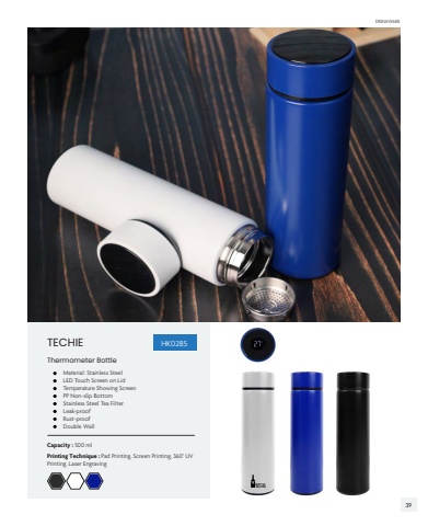 TECHIECapacity : 500 mlPrinting Technique : Pad Printing, Screen Printing, 360%u00b0 UV Printing, Laser Engraving %u2022 Material: Stainless Steel %u2022 LED Touch Screen on Lid %u2022 Temperature Showing Screen %u2022 PP Non-slip Bottom %u2022 Stainless Steel Tea Filter %u2022 Leak-proof %u2022 Rust-proof %u2022 Double WallThermometer BottleHK0285DRINKWARE39
