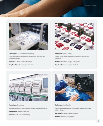 Technique : Embroidery Technique : Heat TransferTechnique : DTF (Direct-to-Film) Printing Technique : Epoxy CoatingBest For : Rich, textured brandingBest For : Precise, vivid graphicsBest For : T-shirts, hoodies, tote bags Best For : Keychains, badges, name platesKey Benefit : Apparel, caps, bagsKey Benefit : Apron, t-shirts, hoodiesKey Benefit : Soft-touch, durable prints Key Benefit : Premium, glass-like lookDecorative stitching with coloured threads or embellishments. Heat and pressure apply vinyl or printed transfers for sharp, vibrant designs.Transfers detailed designs from film to fabric with heat and adhesive powder.Glossy, tough protective layer that resists scratches and chemicals.PRINTING TECHNIQUE PRINTING TECHNIQUE4 5