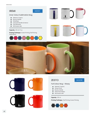 IREMICapacity : 325 ml/11 ozPrinting Technique : Screen Printing, Pad Printing, Sublimation%u2022 Material: Ceramic%u2022 Roomy Handle%u2022 Wide Base%u2022 Coloured Handle & Interior%u2022 Chip Resistant%u2022 Microwave-safeInner Colour Sublimation MugHK0101ZESTOCapacity : 325 mlPrinting Technique : Pad Printing, Screen Printing%u2022 Material: Ceramic%u2022 Glossy Finish%u2022 Roomy Handle%u2022 Wide, Round Base%u2022 Microwave-safeFull Colour Mug - GlossyHK0098DRINKWARE42