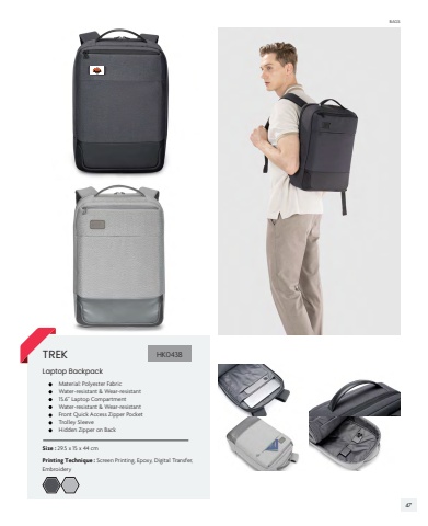 TREKSize : 29.5 x 15 x 44 cm %u2022 Material: Polyester FabricWater-resistant & Wear-resistant 15.6%u2019%u2019 Laptop CompartmentWater-resistant & Wear-resistantFront Quick Access Zipper PocketTrolley SleeveHidden Zipper on BackLaptop BackpackHK0438Printing Technique : Screen Printing, Epoxy, Digital Transfer, EmbroideryBAGS47