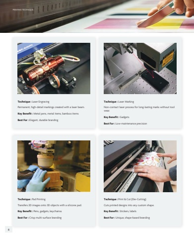 Technique : Laser EngravingTechnique : Pad PrintingTechnique : Laser MarkingTechnique : Print & Cut (Die-Cutting)Best For : Elegant, durable brandingBest For : Crisp multi-surface brandingBest For : Low-maintenance precisionBest For : Unique, shape-based brandingKey Benefit : Metal pens, metal items, bamboo itemsKey Benefit : Pens, gadgets, keychainssKey Benefit : GadgetsKey Benefit : Stickers, labelsPermanent, high-detail markings created with a laser beam.Transfers 2D images onto 3D objects with a silicone pad.Non-contact laser process for long-lasting marks without tool wear.Cuts printed designs into any custom shape.PRINTING TECHNIQUE PRINTING TECHNIQUE6 7