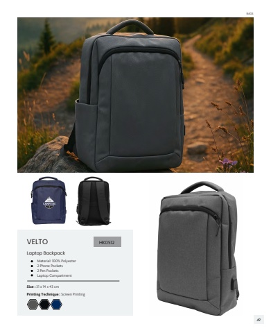 VELTOSize : 31 x 14 x 43 cm %u2022 Material: 100% Polyester2 Phone Pockets2 Pen PocketsLaptop CompartmentLaptop Backpack HK0512Printing Technique : Screen PrintingBAGS49