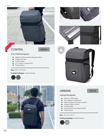 CONTRAURBANESize : 30.5 x 17 x 45 cmSize : 29 x 13.5 x 44 cm%u2022 Material: Water-resistant Polyester FabricHidden TSA Lock2 Side Pockets15.6%u201d Laptop Compartment Trolley Sleeve%u2022 Material: 1200D Fabric15.6%u201d Laptop Compartment Water-resistant and Wear-resistant Durable Rubber Handle2 Side PocketsFront Quick Access Zipper PocketTrolley SleeveAnti-theft Backpack Laptop Backpack HK0435HK0436Printing Technique : Screen PrintingPrinting Technique : Screen PrintingBAGS50