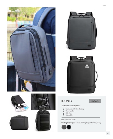 ICONICSize : 43 x 32 x 20 cm%u2022 Backpack with Film CoatingTwo HandlesUSB PortExtensible 2 Handle BackpackHK0465Printing Technique : Screen Printing, Digital Transfer, EpoxyBAGS51