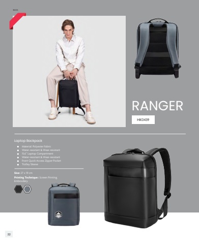 RANGERSize: 27 x 19 cm%u2022 Material: Polyester FabricWater-resistant & Wear-resistant 15.6%u2019%u2019 Laptop CompartmentWater-resistant & Wear-resistantFront Quick Access Zipper PocketTrolley SleeveLaptop Backpack HK0439Printing Technique : Screen Printing, EmbroideryBAGS52