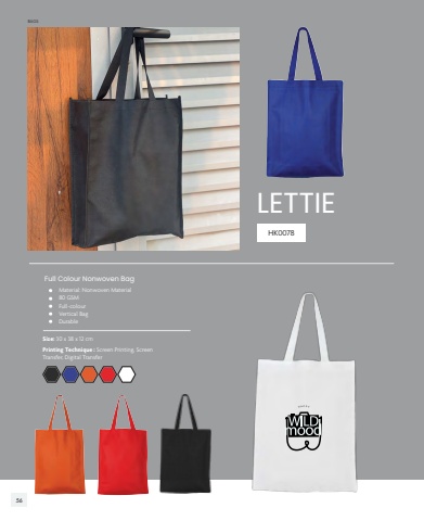 LETTIESize: 30 x 38 x 12 cm%u2022 Material: Nonwoven Material80 GSMFull-colourVertical BagDurable Full Colour Nonwoven BagHK0078Printing Technique : Screen Printing, Screen Transfer, Digital TransferBAGS56