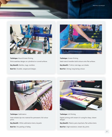 Technique : Round Screen PrintingTechnique : SublimationTechnique : Screen PrintingTechnique : UV PrintingBest For : Durable, wraparound designsBest For : No peeling or fadingBest For : Strong, long-lasting coloursBest For : High-resolution, instant-dry printsKey Benefit : Bottles, mugs, tumblersKey Benefit : White sublimation items, lanyardsKey Benefit : T-shirts, tote bags, sun-shadesKey Benefit : Plastics pens, keychains, flat surface itemsPrints seamless designs on cylindrical or curved surfaces.Heat embeds dye into material for permanent, full-colour prints.Mesh stencil transfers bold colours onto flat surfaces.Digital printing with instant UV curing for sharp, vibrant designs.PRINTING TECHNIQUE PRINTING TECHNIQUE6 7