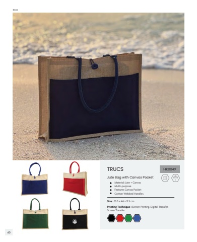 TRUCSSize : 35.5 x 46 x 11.5 cm%u2022 Material: Jute + CanvasMulti-purposeFeatures Canvas PocketCotton Webbed HandlesJute Bag with Canvas Pocket HK0049Printing Technique : Screen Printing, Digital Transfer, Screen TransferBAGS60