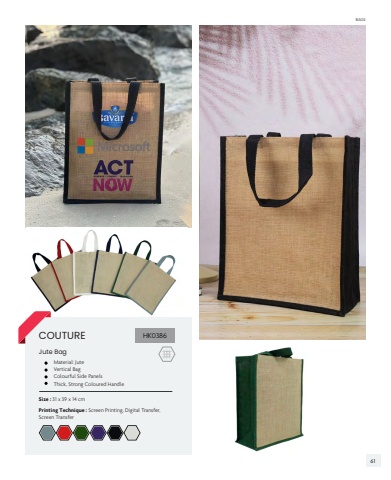 COUTURESize : 31 x 39 x 14 cm%u2022 Material: JuteVertical BagColourful Side PanelsThick, Strong Coloured HandleJute Bag HK0386Printing Technique : Screen Printing, Digital Transfer, Screen TransferBAGS61