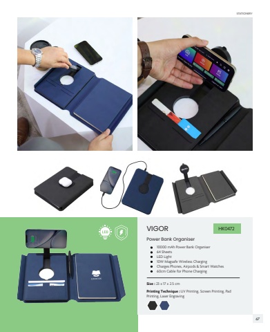 VIGORSize : 23 x 17 x 2.5 cmPrinting Technique : UV Printing, Screen Printing, Pad Printing, Laser Engraving%u2022 10000 mAh Power Bank Organiser%u2022 64 Sheets%u2022 LED Light%u2022 10W Magsafe Wireless Charging%u2022 Charges Phones, Airpods & Smart Watches%u2022 60cm Cable for Phone ChargingPower Bank OrganiserHK0472STATIONERY67