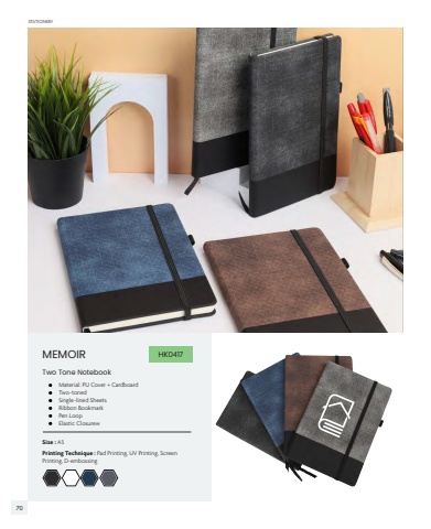 MEMOIRSize : A5Printing Technique : Pad Printing, UV Printing, Screen Printing, D-embossing%u2022 Material: PU Cover + CardboardTwo-tonedSingle-lined SheetsRibbon BookmarkPen LoopElastic ClosurewTwo Tone NotebookHK0417STATIONERY70
