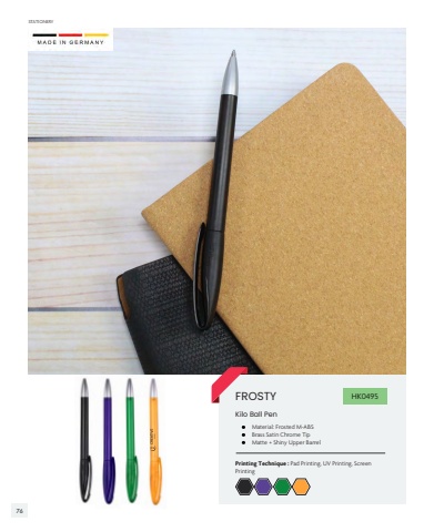 FROSTYPrinting Technique : Pad Printing, UV Printing, Screen Printing%u2022 Material: Frosted M-ABS Brass Satin Chrome TipMatte + Shiny Upper BarrelKilo Ball PenHK0495STATIONERY76