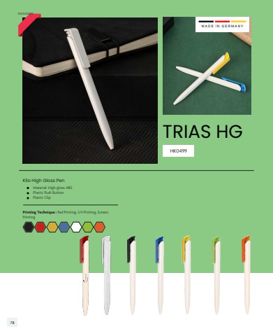 TRIAS HG%u2022 Material: High-gloss ABS Plastic Push ButtonPlastic ClipKlio High Gloss PenHK0499Printing Technique : Pad Printing, UV Printing, Screen PrintingSTATIONERY78